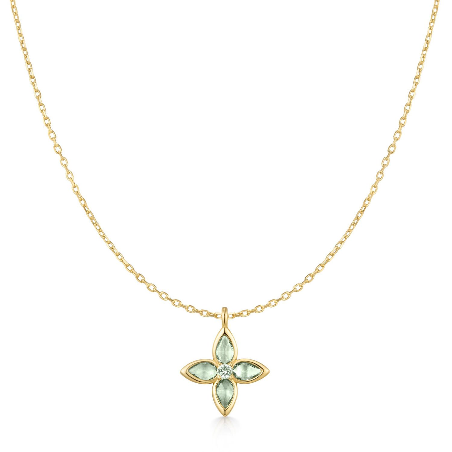 Deze mintgroene, zwevende klaver met vier blaadjes straalt een zorgeloze charme uit en wiegt speels mee met elke beweging, een tijdloos symbool van geluk. Combineer deze ketting met andere schakelkettingen voor een perfect geheel vol vreugde, waarmee je de onverwachte momenten van het leven viert bij elke glinstering.