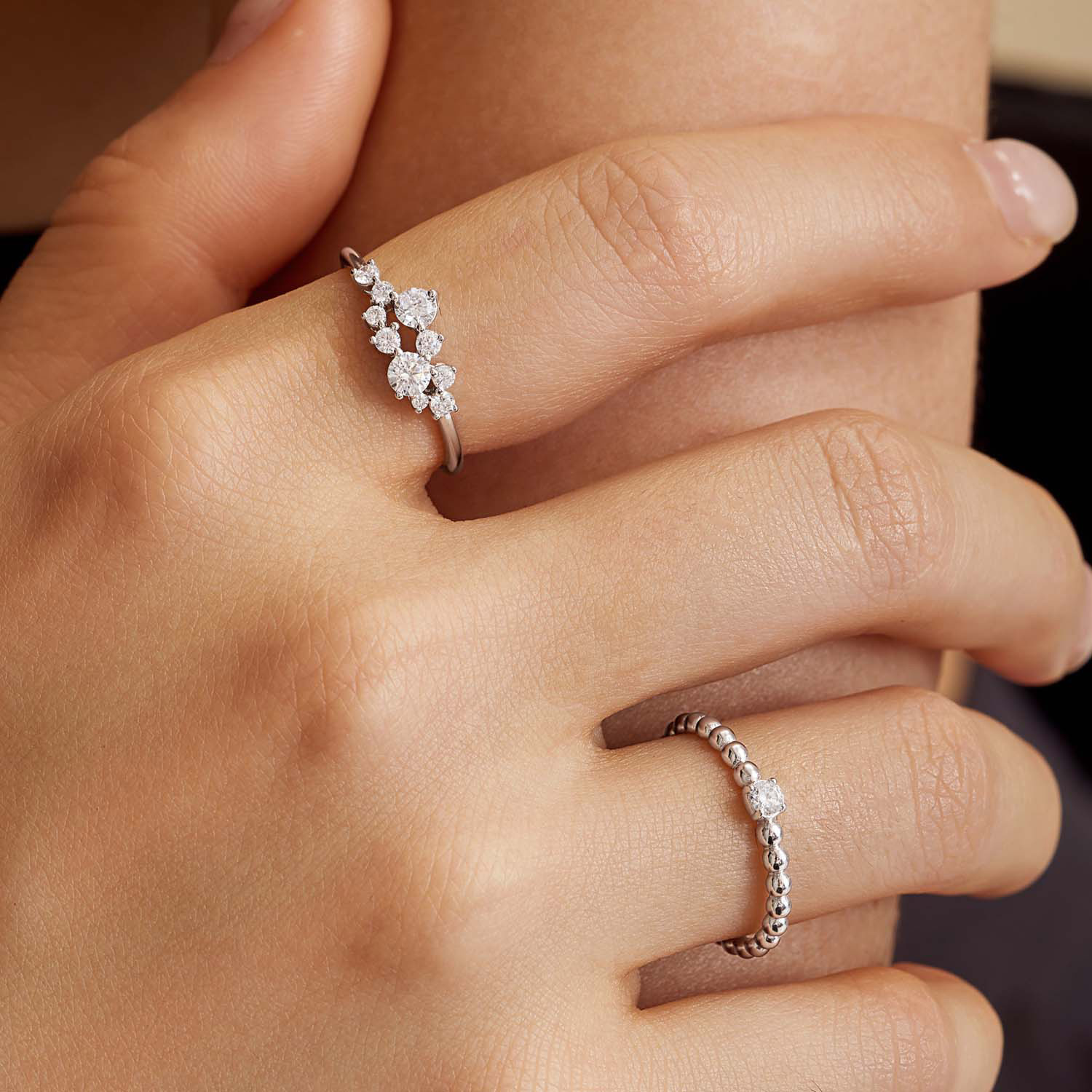 Je zult zeker verliefd worden op onze sierlijke ring. Deze ring is gemaakt van meerdere bollen die met elkaar verbonden zijn en heeft een zirkonia in het midden van een band van gerhodineerd sterlingzilver. Stapel hem op met die van jou en pas moeiteloos bij je dagelijkse looks.